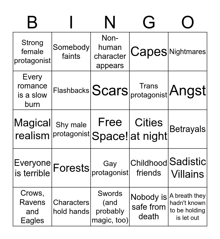 This bingo card has a free space and 24 words: Forests, Characters hold hands, Scars, Crows, Ravens and Eagles, Nightmares, Strong female protagonist, Every romance is a slow burn, Somebody faints, Cities at night, Gay protagonist, Trans protagonist, Magical realism, Childhood friends, Sadistic Villains, Flashbacks, Nobody is safe from death, Betrayals, Non-human character appears, Angst, Shy male protagonist, A breath they hadn't known to be holding is let out, Everyone is terrible, Capes and Swords (and probably magic, too).