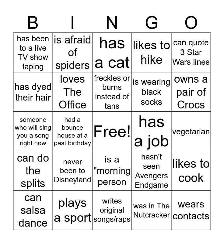 This bingo card has a free space and 24 words: never been to Disneyland, plays a sport, freckles or burns instead of tans, can salsa dance, can quote 3 Star Wars lines, has been to a live TV show taping, has dyed their hair, is afraid of spiders, has a job, is a "morning person, is wearing black socks, someone who will sing you a song right now, hasn't seen Avengers Endgame, likes to cook, loves The Office, was in The Nutcracker, vegetarian, has a cat, owns a pair of Crocs, had a bounce house at a past birthday, wears contacts, can do the splits, likes to hike and writes original songs/raps.