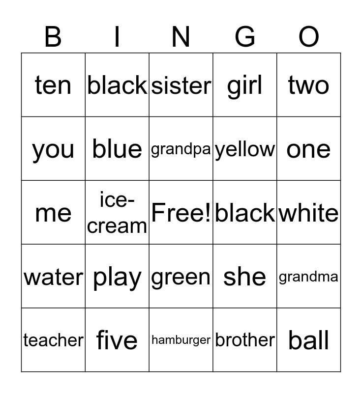 This bingo card has a free space and 29 words: teacher, he, ice-cream, cake, ten, sister, blue, play, black, five, white, ball, hamburger, brother, one, three, green, water, two, me, she, boy, yellow, you, girl, black, grandma, grandpa and they.