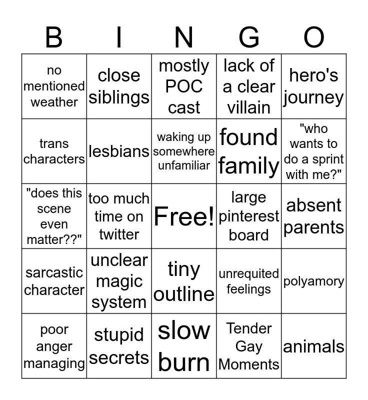 This bingo card has a free space and 24 words: unclear magic system, stupid secrets, waking up somewhere unfamiliar, poor anger managing, hero's journey, no mentioned weather, trans characters, close siblings, large pinterest board, tiny outline, found family, "does this scene even matter??", unrequited feelings, polyamory, lesbians, Tender Gay Moments, absent parents, mostly POC cast, "who wants to do a sprint with me?", too much time on twitter, animals, sarcastic character, lack of a clear villain and slow burn.