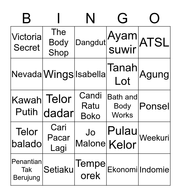 This bingo card has a free space and 24 words: Cari Pacar Lagi, Setiaku, Isabella, Penantian Tak Berujung, ATSL, Victoria Secret, Nevada, The Body Shop, Bath and Body Works, Jo Malone, Tanah Lot, Kawah Putih, Pulau Kelor, Weekuri, Wings, Ekonomi, Ponsel, Dangdut, Agung, Telor dadar, Indomie, Telor balado, Ayam suwir and Tempe orek.