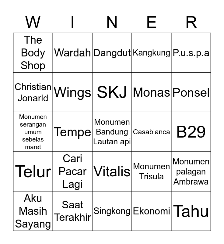 This bingo card has a free space and 24 words: Cari Pacar Lagi, Saat Terakhir, SKJ, Aku Masih Sayang, P.u.s.p.a, The Body Shop, Christian Jonarld, Wardah, Casablanca, Vitalis, Monas, Monumen serangan umum sebelas maret, Monumen Trisula, Monumen palagan Ambrawa, Wings, Ekonomi, B29, Dangdut, Ponsel, Tempe, Tahu, Telur, Kangkung and Singkong.