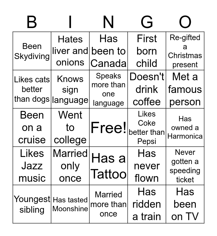 This bingo card has a free space and 24 words: Married only once, Has tasted Moonshine, Speaks more than one language, Youngest sibling, Re-gifted a Christmas present, Been Skydiving, Likes cats better than dogs, Hates liver and onions, Likes Coke better than Pepsi, Has a Tattoo, Doesn't drink coffee, Been on a cruise, Has never flown, Never gotten a speeding ticket, Knows sign language, Has ridden a train, Has owned a Harmonica, Has been to Canada, Met a famous person, Went to college, Has been on TV, Likes Jazz music, First born child and Married more than once.