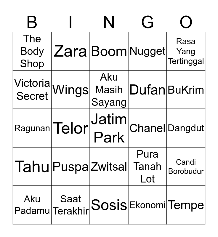 This bingo card has a free space and 24 words: Puspa, Saat Terakhir, Aku Masih Sayang, Aku Padamu, Rasa Yang Tertinggal, The Body Shop, Victoria Secret, Zara, Chanel, Zwitsal, Dufan, Ragunan, Pura Tanah Lot, Candi Borobudur, Wings, Ekonomi, Dangdut, Boom, BuKrim, Telor, Tempe, Tahu, Nugget and Sosis.