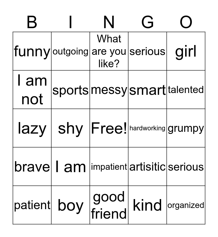 This bingo card has a free space and 24 words: I am, boy, messy, patient, girl, funny, I am not, outgoing, hardworking, impatient, smart, lazy, artisitic, serious, sports, kind, grumpy, What are you like?, talented, shy, organized, brave, serious and good friend.