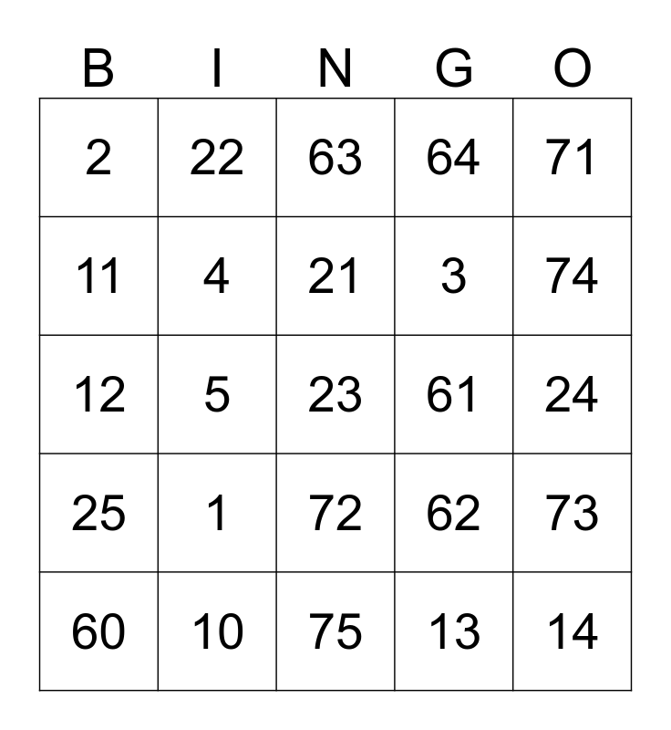 This bingo card has a free space and 24 words: 1, 10, 21, 60, 71, 2, 11, 22, 61, 72, 3, 12, 62, 73, 4, 13, 24, 63, 74, 5, 14, 25, 64 and 75.