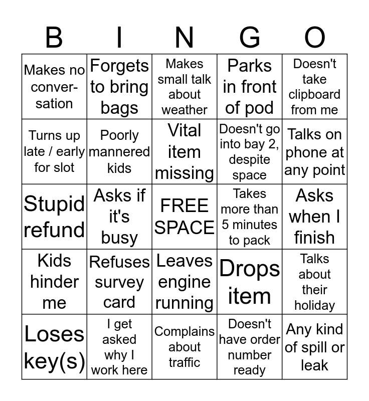 This bingo card has a free space and 27 words: Drops item, Refuses help packing, Doesn't go into bay 2, despite space, Complains about traffic, Turns up late / early for slot, Makes small talk about weather, Forgets to bring bags, Kids hinder me, Takes more than 5 minutes to pack, Talks about their holiday, Stupid refund, Parks in front of pod, Loses key(s), I get asked why I work here, Talks on phone at any point, Packs one-handed, Poorly mannered kids, Vital item missing, Refuses survey card, Makes no conver-sation, Asks when I finish, Doesn't have order number ready, Asks if it's busy, Any kind of spill or leak, Leaves engine running, Doesn't take clipboard from me and Makes unoriginal joke.