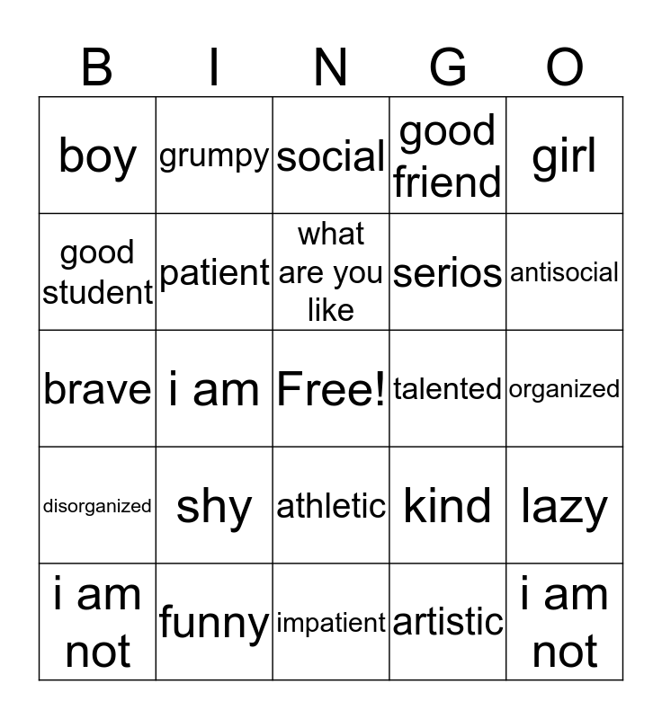 This bingo card has a free space and 24 words: shy, funny, what are you like, i am not, girl, boy, good student, grumpy, talented, athletic, serios, brave, kind, lazy, patient, artistic, organized, social, antisocial, i am, i am not, disorganized, good friend and impatient.
