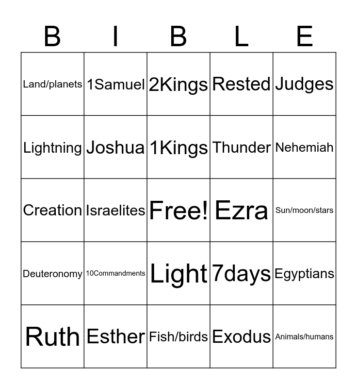 This bingo card has a free space and 34 words: Genesis, Exodus, Leviticus, Numbers, Deuteronomy, Joshua, Judges, Ruth, 1Samuel, 2Samuel, 1Kings, 2Kings, 1Chronicle, 2Chronicle, Ezra, Nehemiah, Esther, Creation, 10Commandments, 7days, Light, Sea/sky, Land/planets, Sun/moon/stars, Fish/birds, Animals/humans, Rested, Moses, Thunder, Lightning, Smoke, Israelites, Egyptians and Slaves.