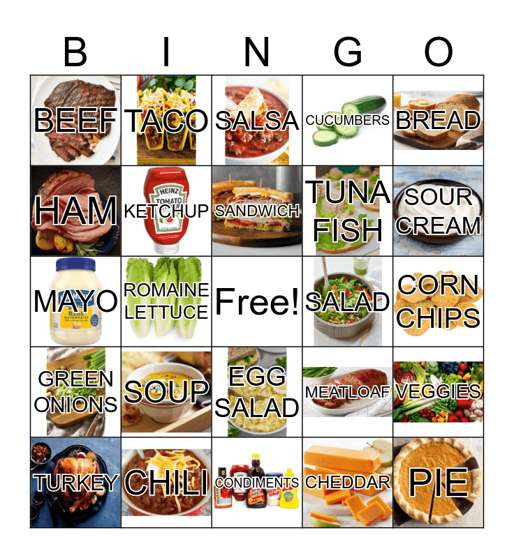 This bingo card has 24 images, a free space and 24 words: SOUP, CHILI, SANDWICH, TURKEY, BREAD, BEEF, HAM, TACO, SALAD, EGG SALAD, TUNA FISH, MAYO, MEATLOAF, VEGGIES, KETCHUP, CHEDDAR, CORN CHIPS, SALSA, SOUR CREAM, ROMAINE LETTUCE, PIE, GREEN ONIONS, CUCUMBERS and CONDIMENTS.