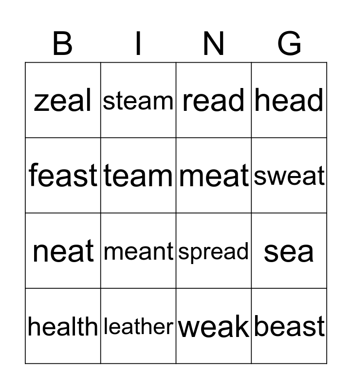 This bingo card has 16 words: leather, sea, read, zeal, neat, steam, spread, weak, feast, team, health, head, meant, sweat, meat and beast.