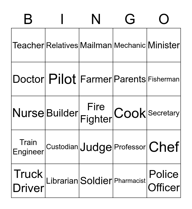 This bingo card has 25 words: Custodian, Soldier, Farmer, Truck Driver, Minister, Teacher, Doctor, Relatives, Cook, Judge, Parents, Nurse, Professor, Chef, Pilot, Police Officer, Secretary, Mailman, Fisherman, Builder, Fire Fighter, Librarian, Train Engineer, Mechanic and Pharmacist.
