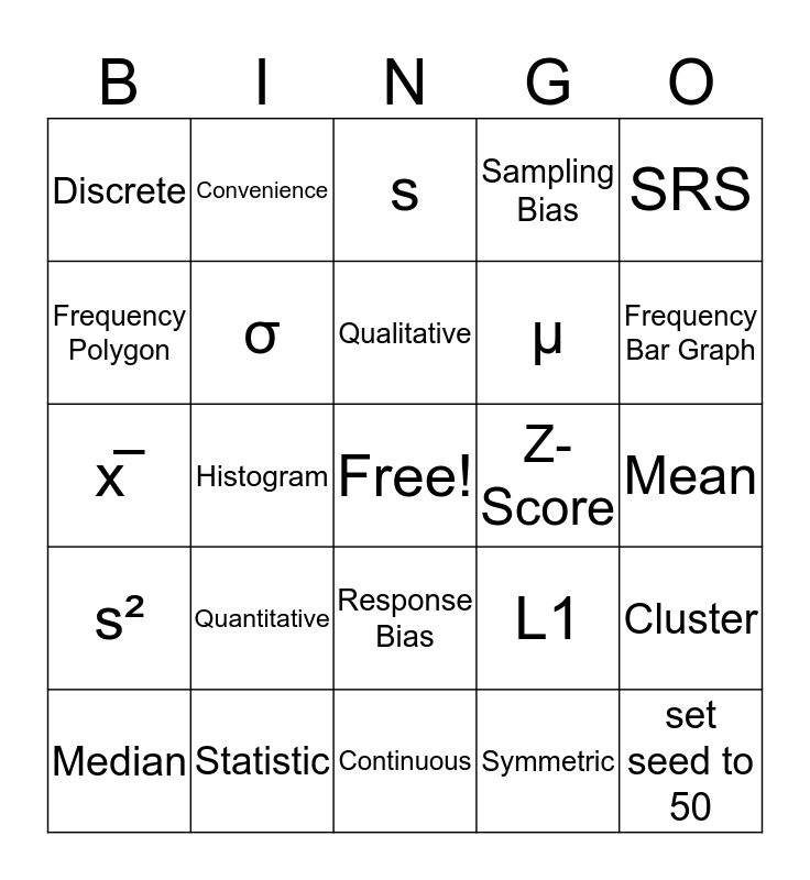 This bingo card has a free space and 34 words: Mode, Symmetric, L2, Parameter, s², σ, SRS, Median, Convenience, Observational Study, Qualitative, s, σ², Response Bias, Z-Score, Frequency Bar Graph, Statistic, x ̅, Quantitative, L1, Response Bias, Designed Experiment, Discrete, Mean, Continuous, set seed to 50, Sampling Bias, Stratified, µ, Frequency Polygon, Frequency Ogive, Histogram, Cluster and Weighted Mean.