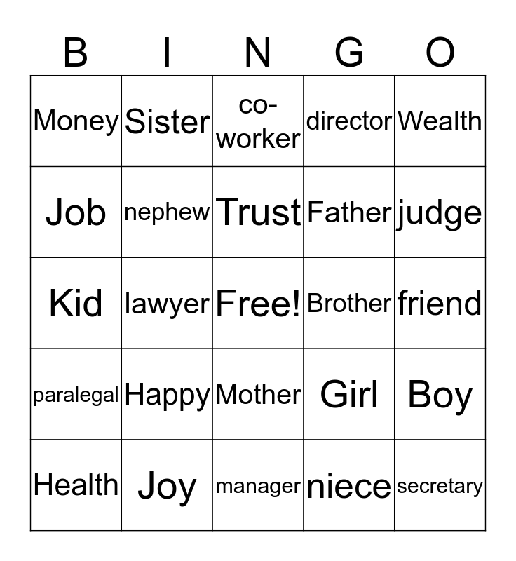 This bingo card has a free space and 24 words: Happy, Joy, Trust, Health, Wealth, Money, Job, Sister, Brother, Mother, Father, Kid, Girl, Boy, nephew, niece, friend, co-worker, judge, lawyer, secretary, paralegal, director and manager.
