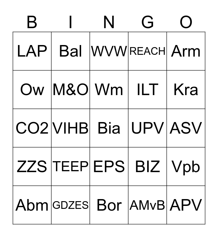 This bingo card has 25 words: TEEP, Bor, Wm, Abm, Arm, LAP, Ow, Bal, UPV, EPS, ILT, CO2, BIZ, Vpb, M&O, APV, ASV, WVW, Kra, VIHB, Bia, GDZES, ZZS, REACH and AMvB.