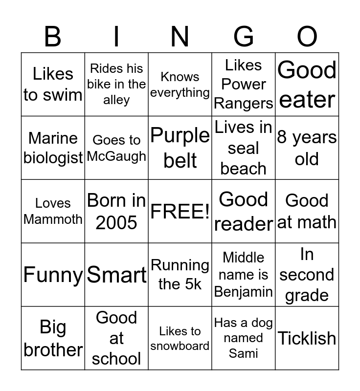 This bingo card has a free space and 24 words: Smart, Good at school, Purple belt, Big brother, Good eater, Likes to swim, Marine biologist, Rides his bike in the alley, Good reader, Running the 5k, Lives in seal beach, Loves Mammoth, Middle name is Benjamin, In second grade, Goes to McGaugh, Has a dog named Sami, Good at math, Knows everything, 8 years old, Born in 2005, Ticklish, Funny, Likes Power Rangers and Likes to snowboard.