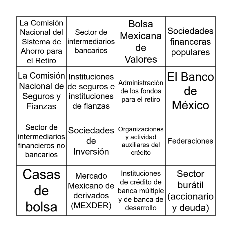 This bingo card has 26 words: Sistema Financiero Mexicano, La Secretaría de Hacienda y Crédito Público (SHCP), El Banco de México, La Comisión Nacional Bancaria y de Valores, La Comisión Nacional de Seguros y Fianzas, La Comisión Nacional del Sistema de Ahorro para el Retiro, Instituciones de seguros e instituciones de fianzas, Sector de intermediarios bancarios, Instituciones de crédito de banca múltiple y de banca de desarrollo, sociedades financieras de objeto limitado y de objeto múltiple, Sector de intermediarios financieros no bancarios, Organizaciones y actividad auxiliares del crédito, Banco del ahorro Nacional y Servicios Financieros (BANCEFI), Confedereaciones, Federaciones, Sociedades Cooperativas de ahorro y préstamo, Sociedades financeras populares, Sector burátil (accionario y deuda), Bolsa Mexicana de Valores, Casas de bolsa, Sociedades de Inversión, Sector bursátil (derivados), Mercado Mexicano de derivados (MEXDER), Asigna Compensación y liquidación, Administración de los fondos para el retiro and Sociedades de inversión especializadas de fondo s para el retiro (SEFORES).