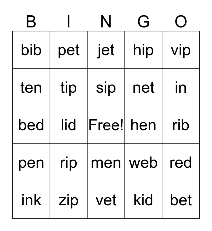 This bingo card has a free space and 27 words: web, egg, net, vet, ten, jet, pet, pen, hen, red, bed, hip, ink, zip, in, lip, tip, sip, rip, bib, rib, kid, lid, bet, men, vip and did.