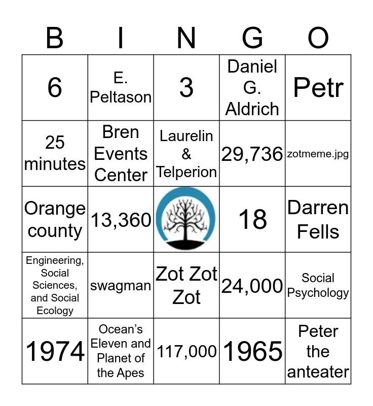 This bingo card has a free space and 24 words: swagman, Ocean’s Eleven and Planet of the Apes, Laurelin & Telperion, 1974, Petr, 6, 25 minutes, E. Peltason, 18, Zot Zot Zot, 29,736, Orange county, 24,000, Social Psychology, Bren Events Center, 1965, Darren Fells, 3, zotmeme.jpg, 13,360, Peter the anteater, Engineering, Social Sciences, and Social Ecology, Daniel G. Aldrich and 117,000.
