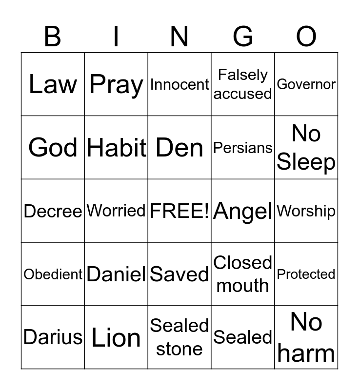 This bingo card has a free space and 24 words: Daniel, Lion, Den, Darius, Governor, Law, God, Pray, Angel, Saved, Persians, Decree, Closed mouth, Protected, Habit, Sealed, Worship, Innocent, No Sleep, Worried, No harm, Obedient, Falsely accused and Sealed stone.