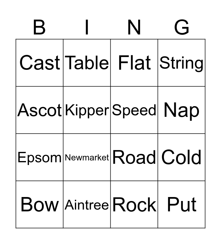 This bingo card has 16 words: Aintree, Cold, Flat, Cast, Epsom, Table, Road, Rock, Ascot, Kipper, Bow, String, Newmarket, Nap, Speed and Put.
