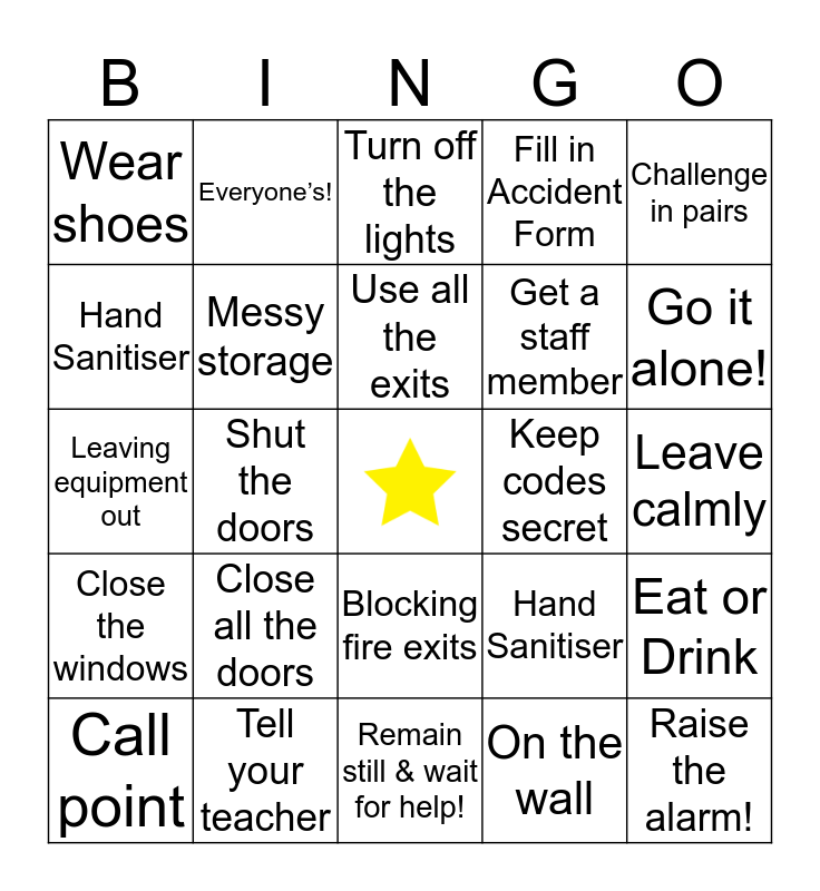 This bingo card has a free space and 24 words: Close all the doors, Tell your teacher, Use all the exits, Call point, Challenge in pairs, Wear shoes, Hand Sanitiser, Everyone’s!, Keep codes secret, Blocking fire exits, Get a staff member, Leaving equipment out, Hand Sanitiser, Eat or Drink, Messy storage, On the wall, Leave calmly, Turn off the lights, Go it alone!, Shut the doors, Raise the alarm!, Close the windows, Fill in Accident Form and Remain still & wait for help!.