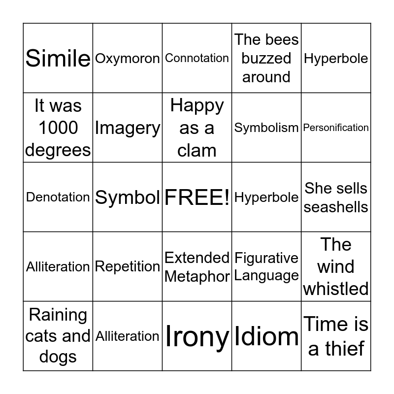 This bingo card has a free space and 30 words: Alliteration, Metaphor, Symbol, Pun, Simile, Connotation, Imagery, Extended Metaphor, Hyperbole, Irony, She sells seashells, Time is a thief, Idiom, Oxymoron, Personification, Allusion, Figurative Language, Alliteration, Repetition, Hyperbole, Denotation, Metaphor, Oxymoron, Symbolism, It was 1000 degrees, The bees buzzed around, The wind whistled, Raining cats and dogs, Happy as a clam and He lived his life in chains.