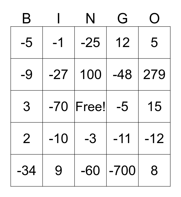 This bingo card has a free space and 29 words: -34, 7, -70, 17, -5, -25, -27, -10, -5, 9, 15, 8, -60, -700, 279, -2, -3, 2, 5, 3, -11, 25, -48, -9, 12, -1, -12, 100 and 30.