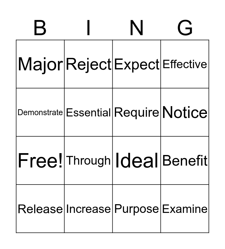 This bingo card has 20 words: Benefit, Challenge, Expect, Physical, Release, Demonstrate, Increase, Major, Free!, Reject, Through, Ideal, Essential, Examine, Require, Task, Notice, Effective, Purpose and Similar.