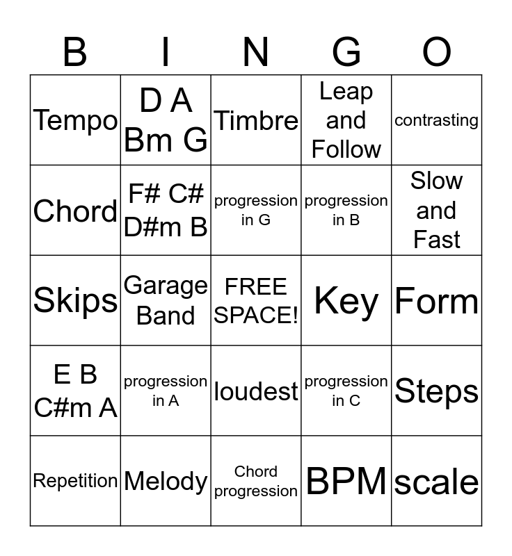This bingo card has a free space and 27 words: progression in C, progression in Db, progression in B, Chord progression, Chord, Timbre, D A Bm G, E B C#m A, Key, Steps, Skips, Leap and Follow, Repetition, Melody, Slow and Fast, progression in F, F# C# D#m B, progression in G, progression in A, Tempo, Form, BPM, Garage Band, scale, loudest, contrasting and high.