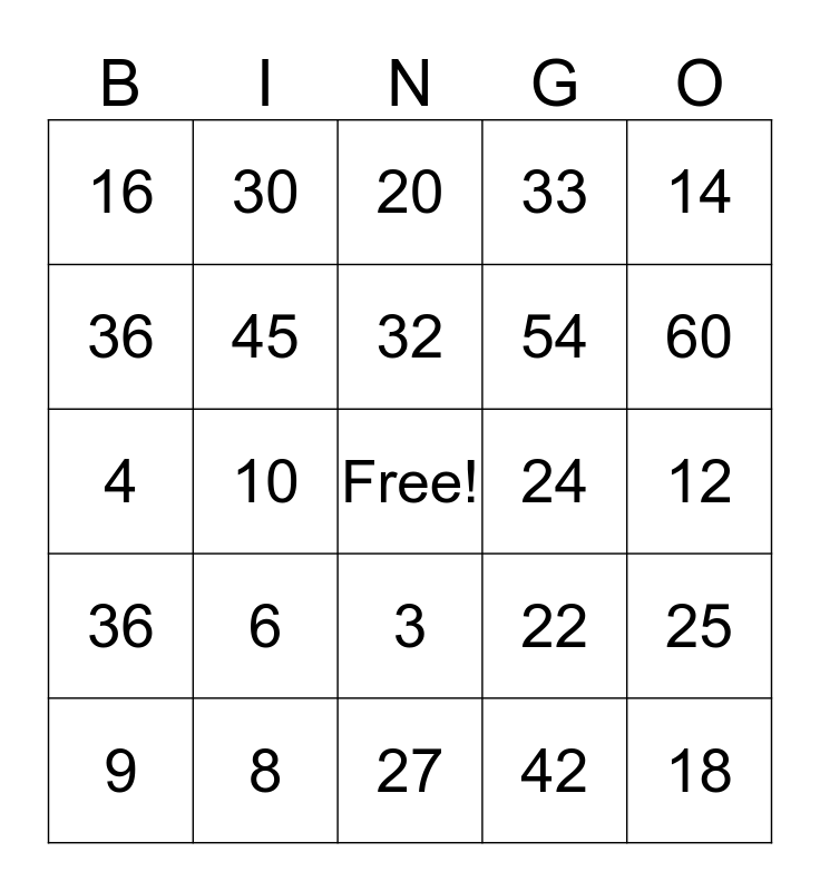 This bingo card has a free space and 25 words: 36, 8, 27, 42, 14, 16, 30, 20, 24, 25, 36, 45, 66, 22, 60, 9, 10, 32, 54, 12, 4, 6, 3, 33 and 18.