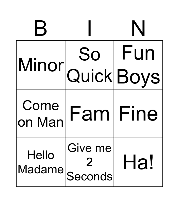 This bingo card has a free space and 8 words: Fine, Fun Boys, So Quick, Hello Madame, Minor, Ha!, Come on Man and Give me 2 Seconds.