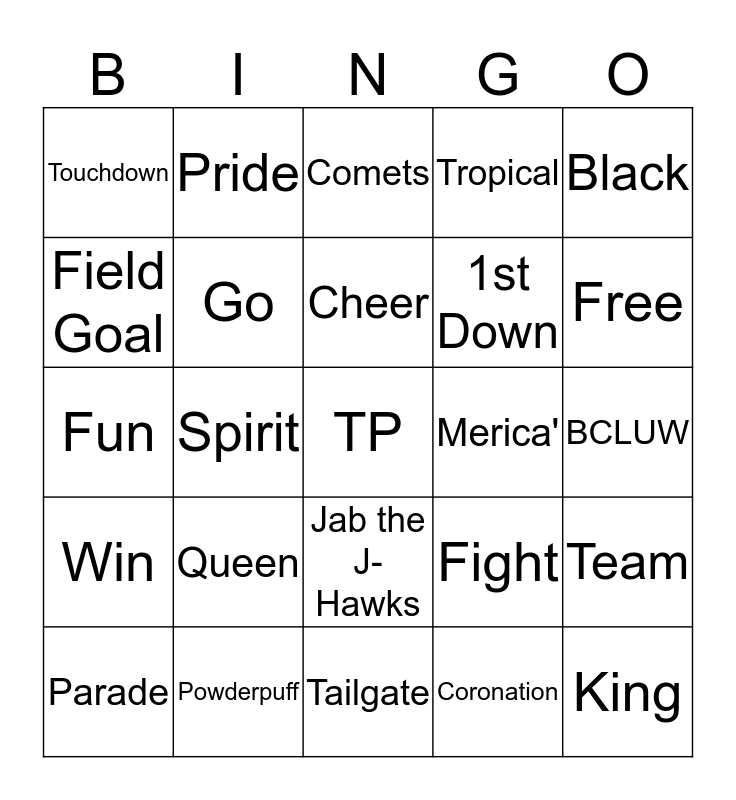 This bingo card has 36 words: Hoco, Football, Dance, Go, Fight, Win, Cheer, #Allin, Black, Gold, Spirit, Tropical, Western, Merica', Free, Touchdown, King, Queen, TP, Comets, BCLUW, Team, Powderpuff, Parade, Tailgate, Pride, Fun, Victory, 1st Down, Field Goal, Pom Pom, Megaphone, Coronation, Jab the J-Hawks, Tradition and 2019.