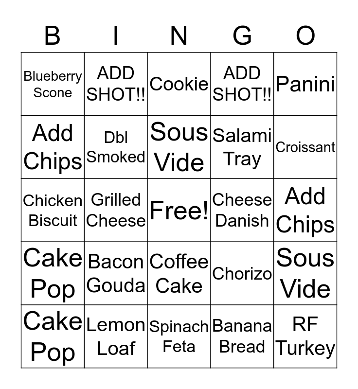 This bingo card has a free space and 29 words: Cake Pop, Panini, Grilled Cheese, Pumpkin Loaf, Blueberry Scone, Cookie, Dbl Smoked, Bacon Gouda, Cheese Danish, Lemon Loaf, Add Chips, RF Turkey, Spinach Feta, Banana Bread, Croissant, Ham & Swiss, Coffee Cake, Cake Pop, Panini, Chicken Biscuit, Chorizo, Protein Box, Salami Tray, Add Chips, ADD SHOT!!, ADD SHOT!!, Sous Vide, Sous Vide and Oatmeal.