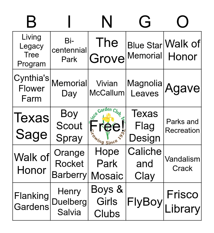 This bingo card has a free space and 34 words: Texas Mountain Laurel, FlyBoy, Memorial Urn, Arbor Fest, Walk of Honor, Memorial Day, Walk of Honor, Flanking Gardens, Bi-centennial Park, UFB, Vivian McCallum, The Grove, Community Garden, Eagle Scout Project, Texas Flag Design, Agave, Henry Duelberg Salvia, Texas Sage, Orange Rocket Barberry, Caliche and Clay, Hope Park Mosaic, VFW, Living Legacy Tree Program, Parks and Recreation, Boys & Girls Clubs, Frisco Library, Blue Star Memorial, Artificial flowers, Magnolia Leaves, Cynthia's Flower Farm, Sundial Repair, Boy Scout Spray, Vandalism Crack and Space for Updated Plaque.