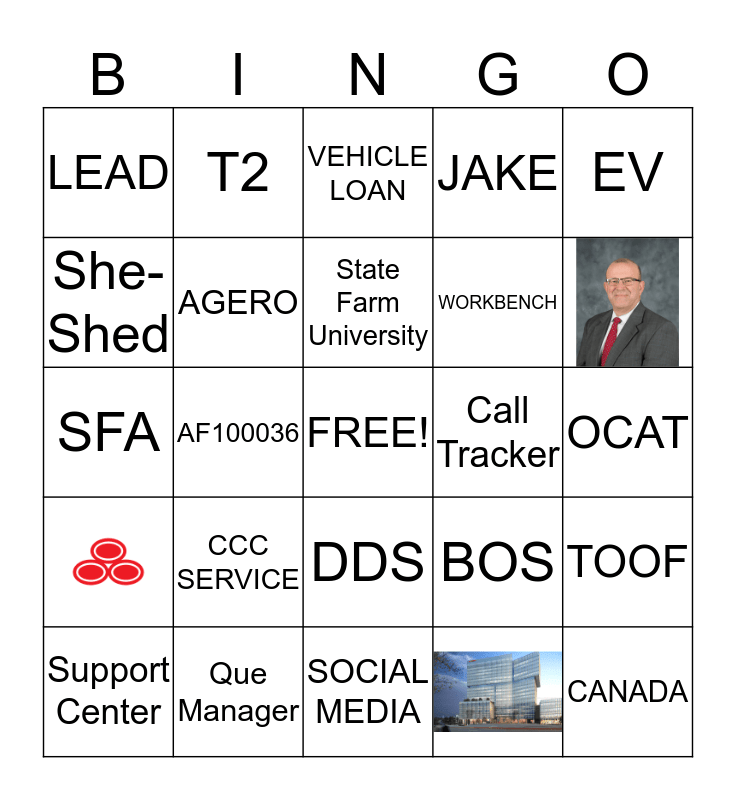 This bingo card has 3 images, a free space and 21 words: CCC SERVICE, Que Manager, State Farm University, Support Center, EV, LEAD, She-Shed, T2, Call Tracker, DDS, WORKBENCH, SFA, BOS, TOOF, AGERO, OCAT, VEHICLE LOAN, AF100036, CANADA, JAKE and SOCIAL MEDIA.