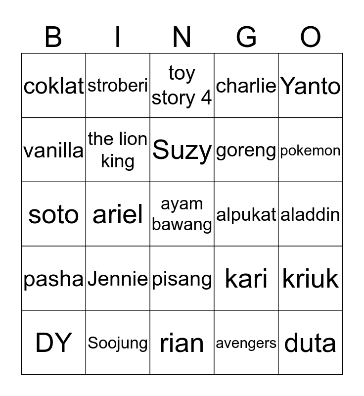This bingo card has a free space and 24 words: Jennie, Soojung, Suzy, DY, Yanto, coklat, vanilla, stroberi, alpukat, pisang, goreng, soto, kari, kriuk, the lion king, avengers, aladdin, toy story 4, pokemon, ariel, duta, pasha, charlie and rian.