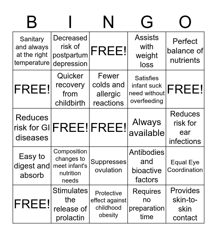This bingo card has a free space and 24 words: Composition changes to meet infant's nutrition needs, Stimulates the release of prolactin, Fewer colds and allergic reactions, FREE!, Perfect balance of nutrients, Sanitary and always at the right temperature, FREE!, Decreased risk of postpartum depression, Always available, Suppresses ovulation, Satisfies infant suck need without overfeeding, Reduces risk for GI diseases, Antibodies and bioactive factors, Equal Eye Coordination, Quicker recovery from childbirth, Requires no preparation time, Reduces risk for ear infections, FREE!, FREE!, FREE!, Provides skin-to-skin contact, Easy to digest and absorb, Assists with weight loss and Protective effect against childhood obesity.
