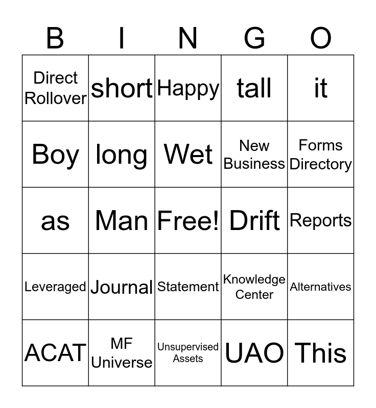 This bingo card has a free space and 75 words: Hi, LOL, Happy, Big, Little, High, Low, This, That, Sun, Moon, Dry, Wet, Boy, Girl, Man, Woman, This, That, it, with, as, long, short, tall, shoes, FINRA, Diligence, Annuities, Client Financials, Statement, Penalties, Regulation 187, Knowledge Center, Forms Directory, New Business, Wealthscape, Alerts, Reports, UAO, Bookmark, Mobile Deposit, Proposal, ICP, Status Viewer, Contra Firm, ACAT, Direct Rollover, Enterprise, LOA, CRIA Form, Statement, Liquidation, Registration, In-Kind, Deposit, LOI, Periodic Plan, Periodic Investment, Asset Movement Authorization, Journal, Standing Instructions, Distribution, Wire, Check, Drift, Asset Allocation, Unauthorized Security, Risk Variance, Alternatives, Leveraged, MF Universe, Rebalance, Unsupervised Assets and FSP Manager.