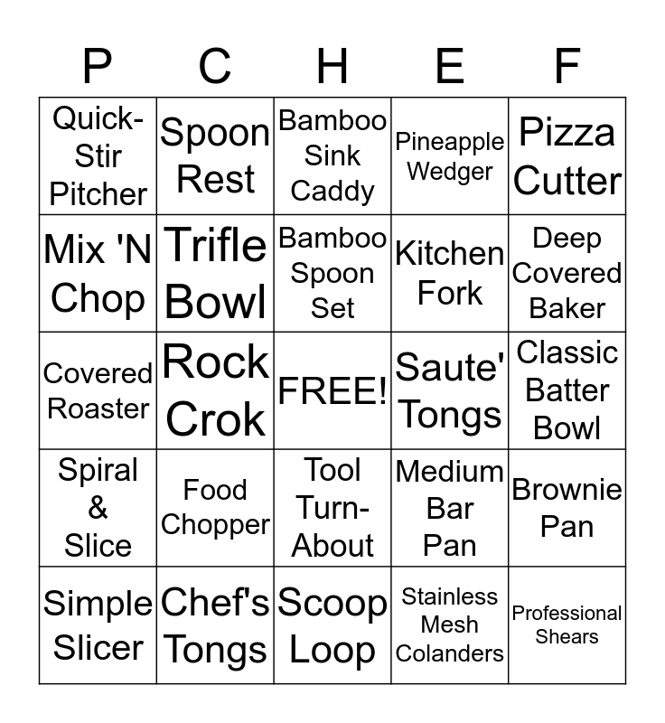 This bingo card has a free space and 24 words: Food Chopper, Chef's Tongs, Bamboo Spoon Set, Simple Slicer, Pizza Cutter, Quick-Stir Pitcher, Mix 'N Chop, Spoon Rest, Saute' Tongs, Tool Turn- About, Kitchen Fork, Covered Roaster, Medium Bar Pan, Brownie Pan, Trifle Bowl, Stainless Mesh Colanders, Classic Batter Bowl, Bamboo Sink Caddy, Deep Covered Baker, Rock Crok, Professional Shears, Spiral & Slice, Pineapple Wedger and Scoop Loop.