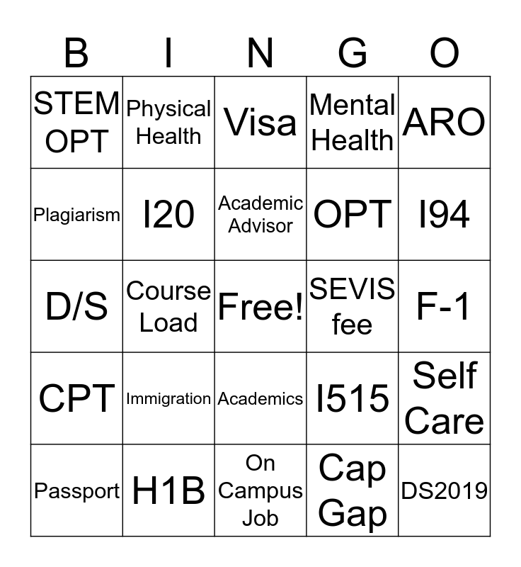 This bingo card has a free space and 29 words: Passport, SEVIS, Course Load, Consulate, STEM OPT, Visa, I20, Immigration, SEVIS fee, H1B, F-1, DS2019, On Campus Job, Cap Gap, I94, CBP, Academics, CPT, ARO, D/S, I515, Register, OPT, Plagiarism, Mental Health, Physical Health, Self Care, Academic Advisor and DSO.
