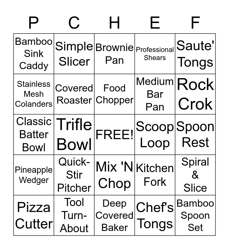 This bingo card has a free space and 24 words: Quick-Stir Pitcher, Tool Turn- About, Food Chopper, Pizza Cutter, Saute' Tongs, Bamboo Sink Caddy, Stainless Mesh Colanders, Simple Slicer, Scoop Loop, Mix 'N Chop, Medium Bar Pan, Classic Batter Bowl, Kitchen Fork, Spiral & Slice, Covered Roaster, Chef's Tongs, Spoon Rest, Brownie Pan, Rock Crok, Trifle Bowl, Bamboo Spoon Set, Pineapple Wedger, Professional Shears and Deep Covered Baker.