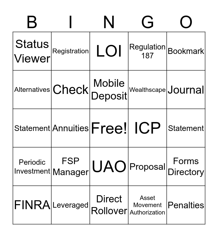 This bingo card has a free space and 49 words: Reports, Penalties, In-Kind, Direct Rollover, FSP Manager, Alerts, Registration, Knowledge Center, Alternatives, Enterprise, Check, Regulation 187, Forms Directory, Proposal, Wire, Rebalance, Mobile Deposit, ICP, Risk Variance, Bookmark, Annuities, Asset Movement Authorization, Status Viewer, Wealthscape, Standing Instructions, Journal, FINRA, Diligence, UAO, Periodic Investment, Drift, Asset Allocation, Contra Firm, LOA, Leveraged, Distribution, CRIA Form, ACAT, Statement, New Business, Client Financials, Unauthorized Security, Liquidation, MF Universe, Statement, LOI, Periodic Plan, Unsupervised Assets and Deposit.
