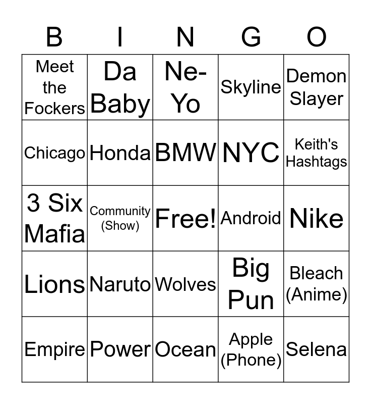 This bingo card has a free space and 24 words: Naruto, Power, BMW, Empire, Demon Slayer, Meet the Fockers, Chicago, Da Baby, Android, Wolves, NYC, 3 Six Mafia, Big Pun, Bleach (Anime), Honda, Apple (Phone), Nike, Ne-Yo, Keith's Hashtags, Community (Show), Selena, Lions, Skyline and Ocean.