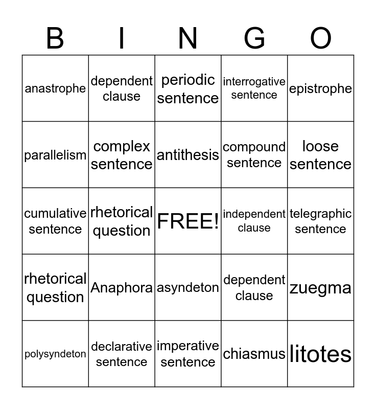 This bingo card has a free space and 24 words: Anaphora, declarative sentence, antithesis, polysyndeton, epistrophe, anastrophe, parallelism, dependent clause, independent clause, asyndeton, compound sentence, cumulative sentence, dependent clause, zuegma, complex sentence, chiasmus, telegraphic sentence, periodic sentence, loose sentence, rhetorical question, litotes, rhetorical question, interrogative sentence and imperative sentence.
