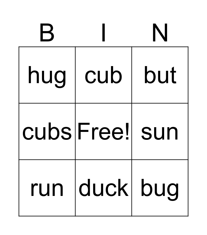 This bingo card has a free space and 19 words: fun, cut, but, shut, hut, bug, rug, hug, cub, jug, bun, sun, run, helps, two, cub, cubs, duck and ducks.