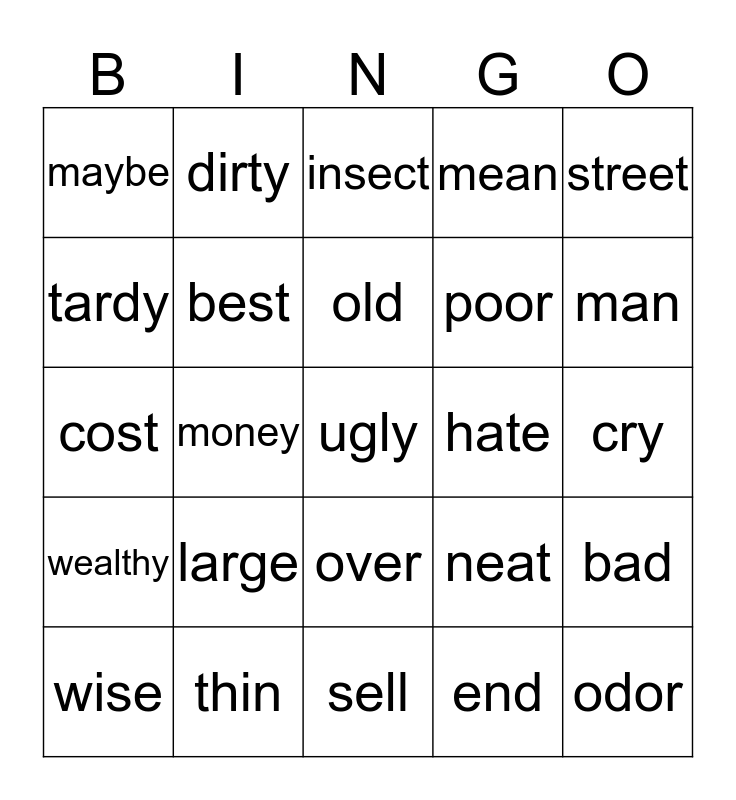 This bingo card has 30 words: thin, car, money, hard, maybe, insect, best, over, hate, sell, cry, ugly, end, odor, man, insect, neat, wealthy, large, street, cost, after, dirty, poor, tardy, mean, bad, wise, old and night.