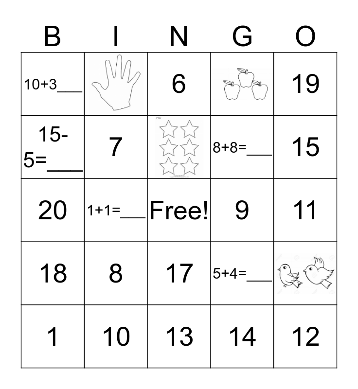 This bingo card has 5 images, a free space and 24 words: 1, 2, 1+1=___, 4, 10+3___, 6, 7, 8, 9, 10, 11, 12, 13, 14, 15, 16, 17, 18, 19, 20, 5+4=___, 6-3=___, 8+8=___ and 15-5=___.
