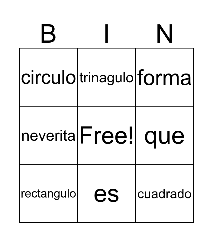This bingo card has a free space and 8 words: que, forma, trinagulo, rectangulo, circulo, cuadrado, neverita and es.