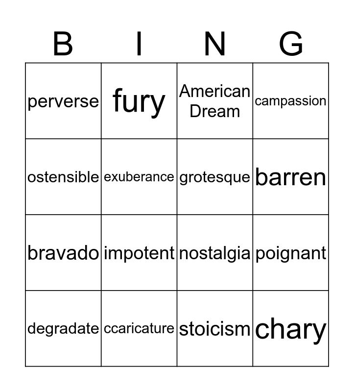 This bingo card has 19 words: nostalgia, futile, American Dream, chary, poignant, ostensible, stoicism, perverse, fury, bravado, impotent, exuberance, grotesque, ccaricature, degradate, squalor, campassion, barren and contrition.